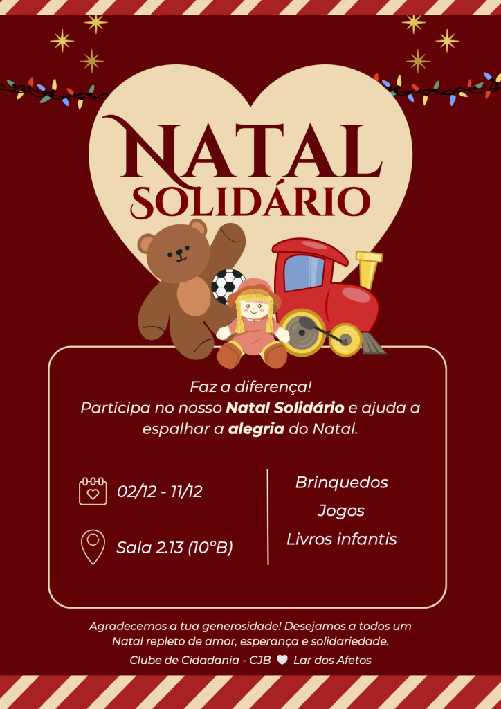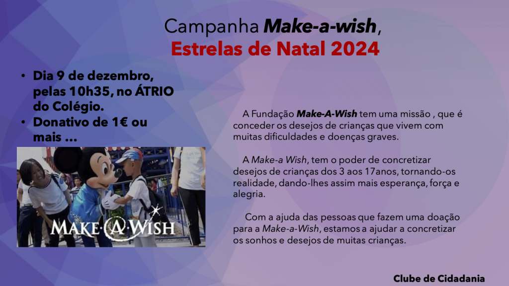 A recolha de donativos para a Make-a -Wish será realizada pelos alunos do Clube de Cidadania, no dia 09-12-24 das 10h35 às 13h no ÁTRIO do Colégio.